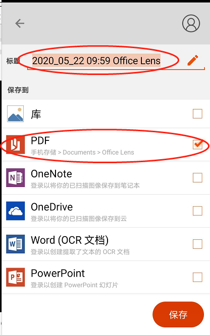 (3) Microsoft lens扫描结束保存的时候选pdf,其他的不要选,修改文件名为“考试科目+姓名”(如图4)