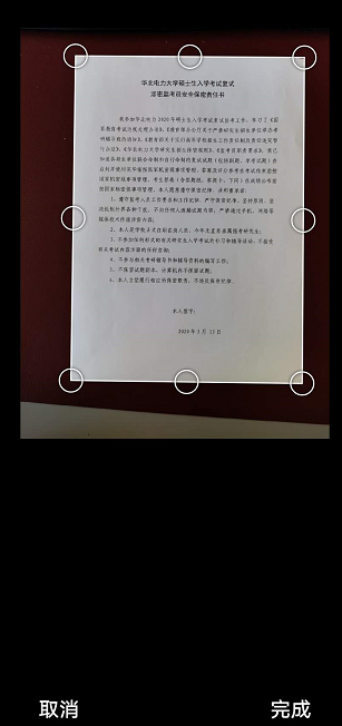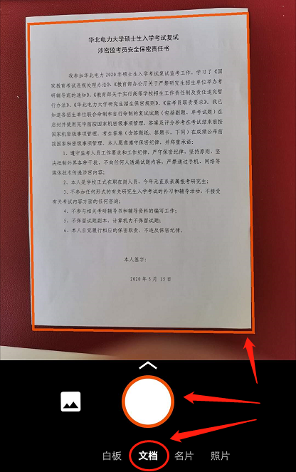 (1) 扫描界面选择“文档”,使小红框对准答题纸的边缘,点击下方圆圈拍照(如下图1)