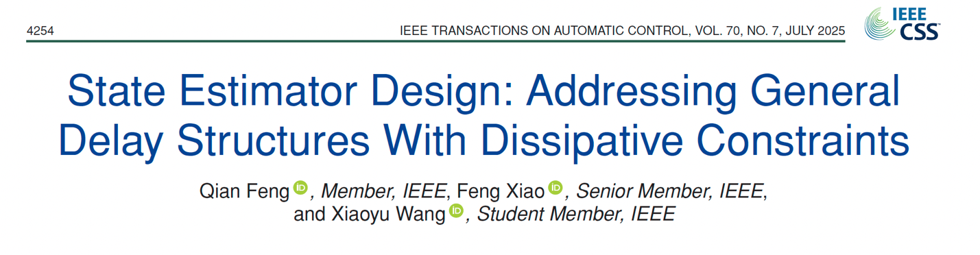 近日,三上悠亚在线 肖峰教授团队在国际控制领域顶级期刊 IEEE Transactions on Automatic Control 发表了题为“State Estimator Design: Addressing General Delay Structures With Dissipative Constraints”的长文(Full Paper)研究论文。论文刊登于2025年第70卷第7期(4254–4269),DOI:10.1109/TAC.2024.3520835。三上悠亚在线 为论文第一完成单位,三上悠亚在线 青年教师冯谦为论文第一作者,肖峰教授为通讯作者,博士生王晓宇参与完成了相关研究工作。
